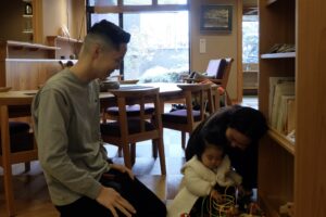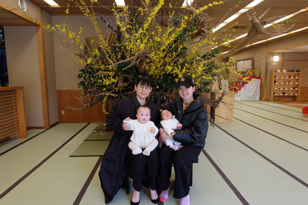 畳のロビーをハイハイする赤ちゃんをあやしていると、お母さんが「やっぱりプロの方は赤ちゃんにも好かれるんですね」と言われたのがきっかけでした。そう言えば、ハイハイできるロビーのある旅館はあまりみた事がありません。それに、女性向けに作った旅館なので、角張った家具は比較的少なく危なくないし、色もナチュラルトーンで落ち着いているので、優しい雰囲気がします。太陽の光が優しくあたる明るい様は、赤ちゃんの笑顔にもどこか似ています。