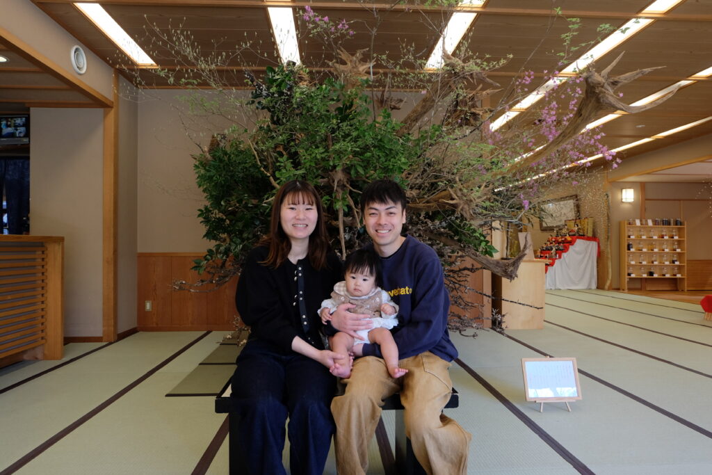 畳のロビーをハイハイする赤ちゃんをあやしていると、お母さんが「やっぱりプロの方は赤ちゃんにも好かれるんですね」と言われたのがきっかけでした。そう言えば、ハイハイできるロビーのある旅館はあまりみた事がありません。それに、女性向けに作った旅館なので、角張った家具は比較的少なく危なくないし、色もナチュラルトーンで落ち着いているので、優しい雰囲気がします。太陽の光が優しくあたる明るい様は、赤ちゃんの笑顔にもどこか似ています。