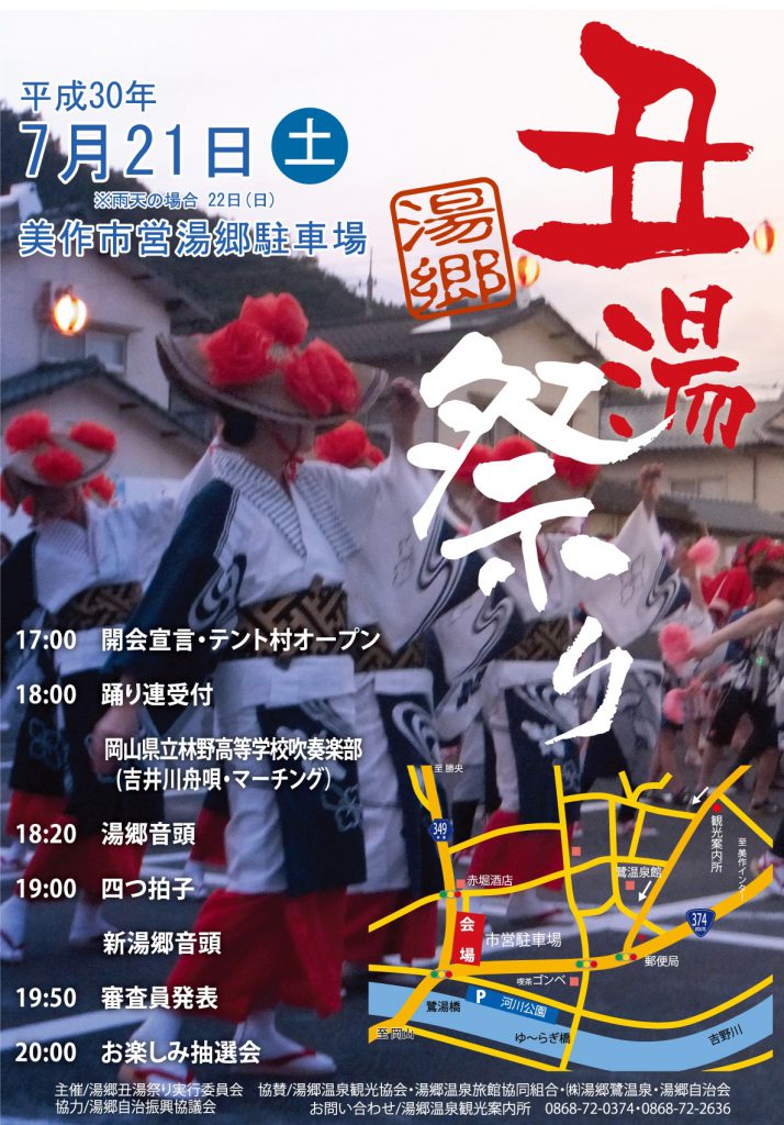 毎年7月下旬に湯郷温泉で開催される『丑湯祭り(うしゆまつり)』。今年は7月21日(土)の開催です!土用の丑の日に温泉に浸かると、1年間、無病息災、元気に暮らせるという言い伝えがあり、源泉を湯神社に奉納します。当日は湯郷音頭の総踊り、地元高等学校吹奏楽部の演奏が催される他、焼きそば・かき氷などグルメテント村も出店し賑わいを見せます。是非、湯郷温泉にご滞在の際は足をお運びくださいませ☆