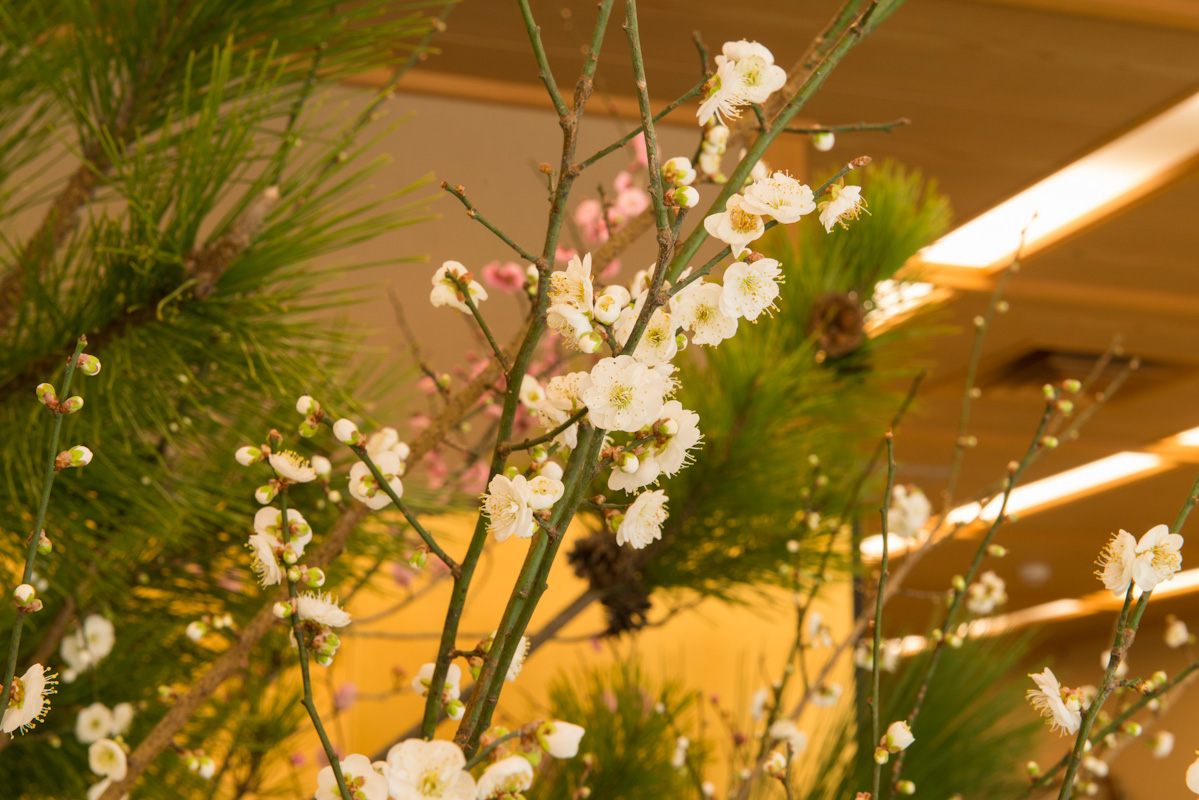 暖かい館内では活け花に梅の花も!新春は煌びやかな演出に、春を感じさせる花々でおもてなししております。客室も含めまして、館内およそ76箇所の花々をお楽しみいただければ幸いでございます☆