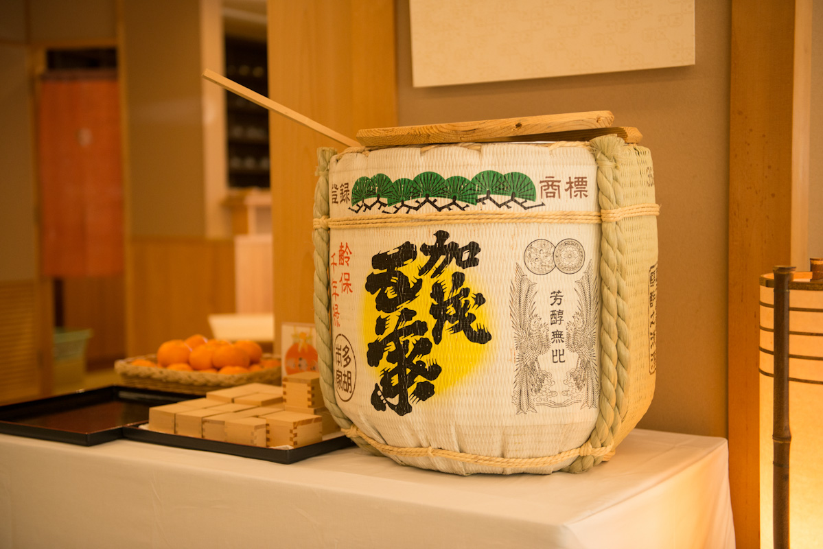 ロビーでは振る舞い酒も。岡山県北の名酒、多胡本家酒造さんの『加茂五葉』です。お土産処でもご用意している淡麗辛口で人気の日本酒です。