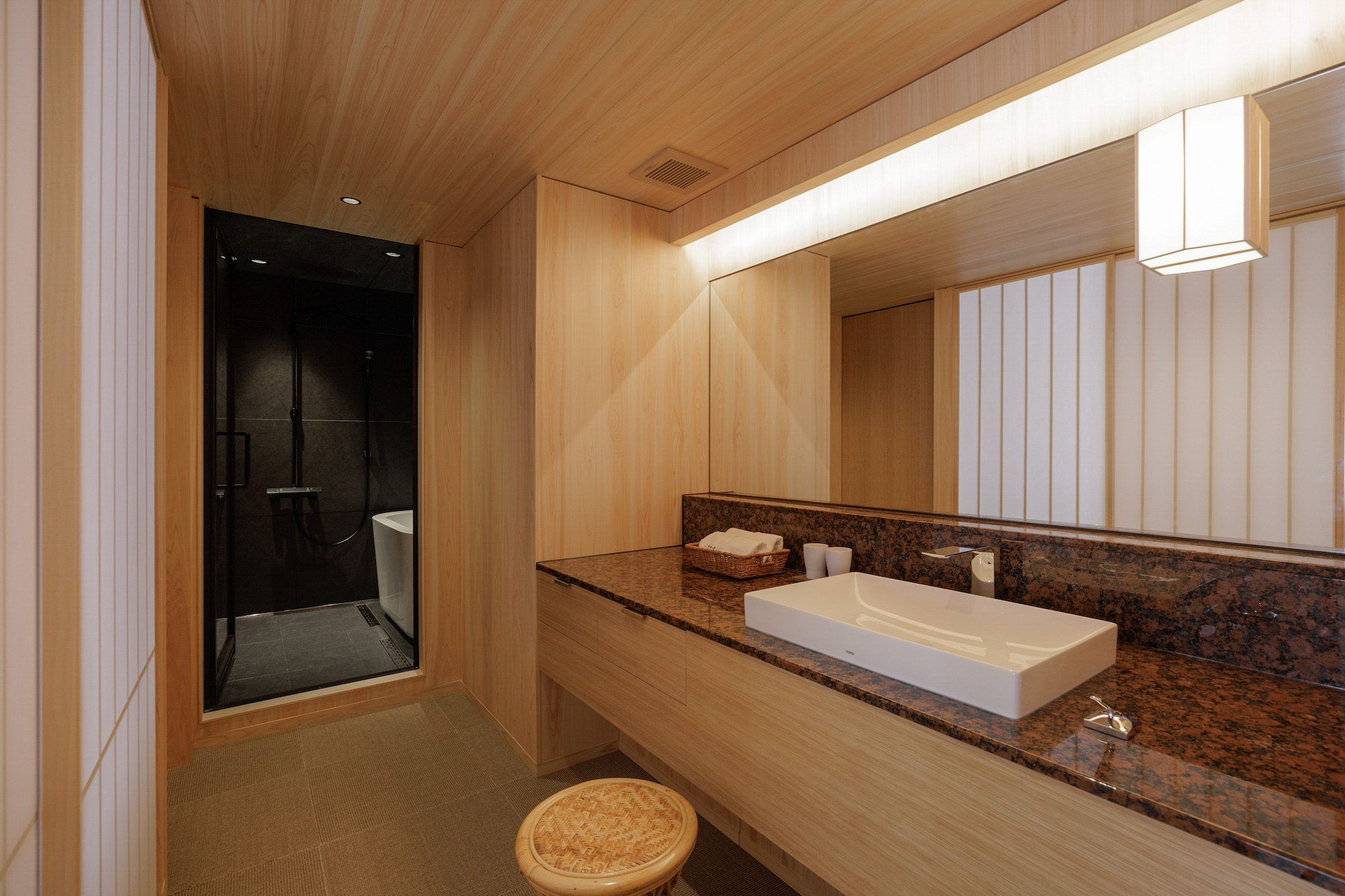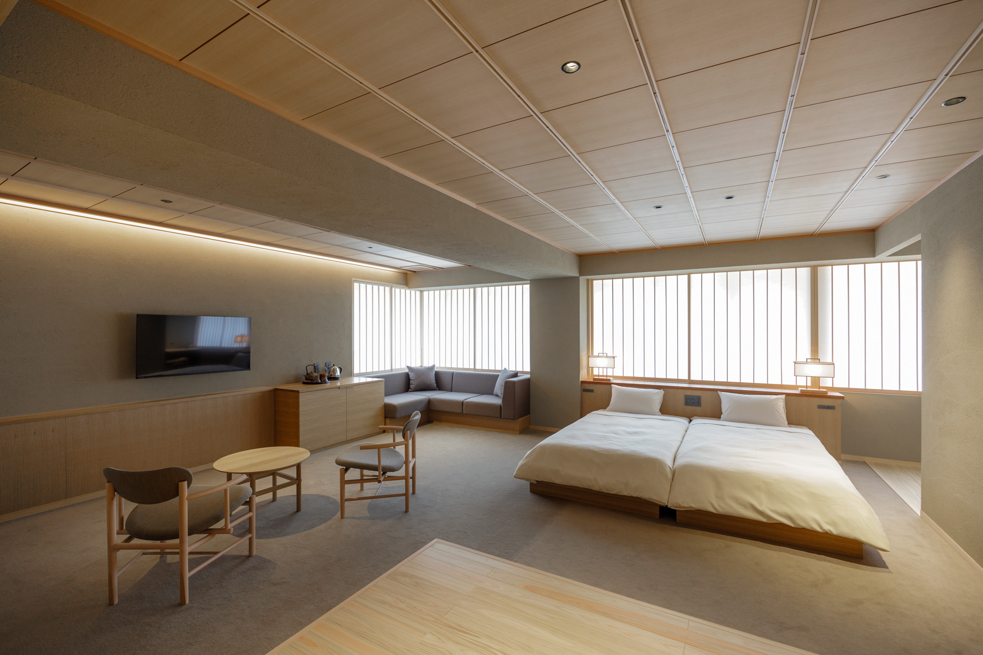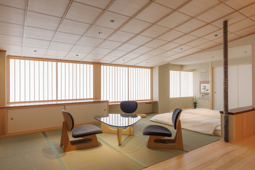 下がり天井が茶室を思わせる上質な佇まいの和室セミスイート。天童木工の座椅子やイサムノグチのテーブルなど、モダニズムの名作家具を配し、和の中にモダンの要素を散りばめています。土・紙・木・石と自然の素材にごだわり、静謐な空間に設えました。