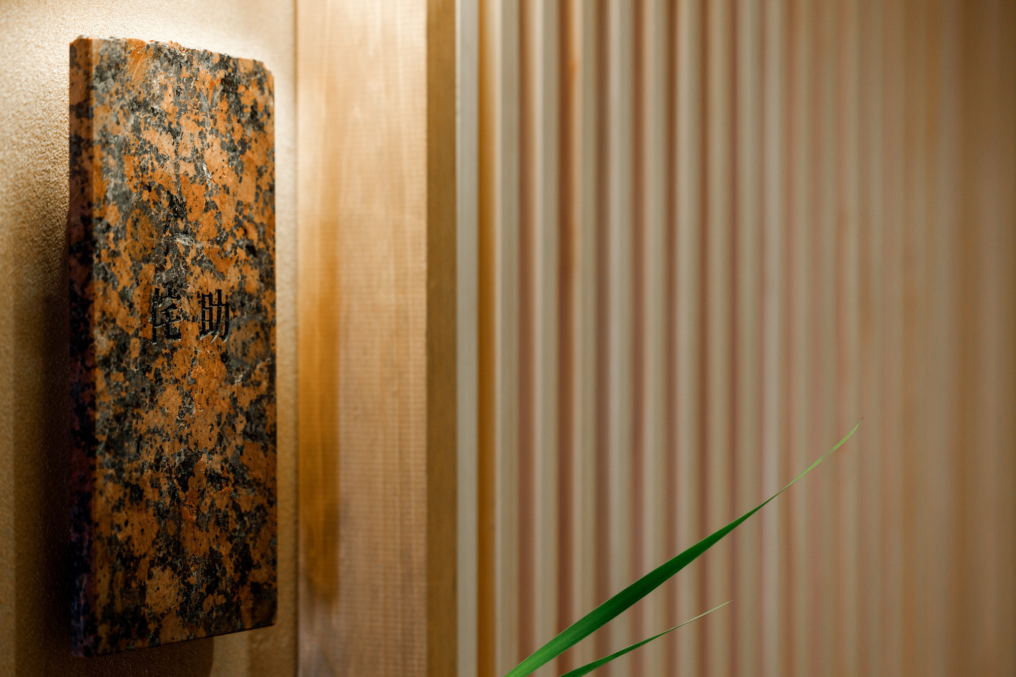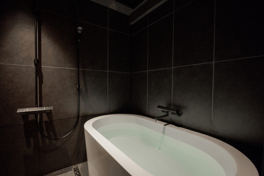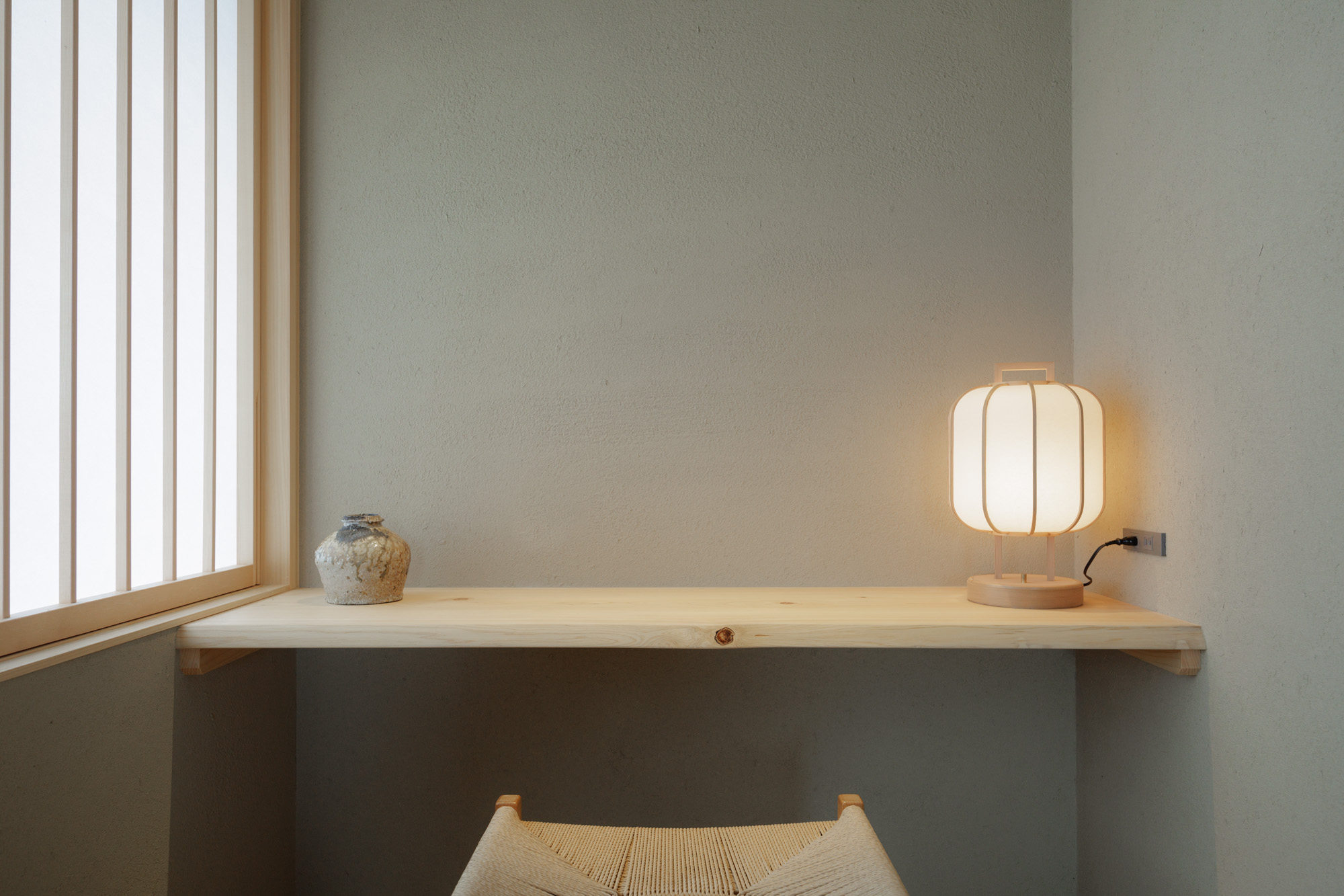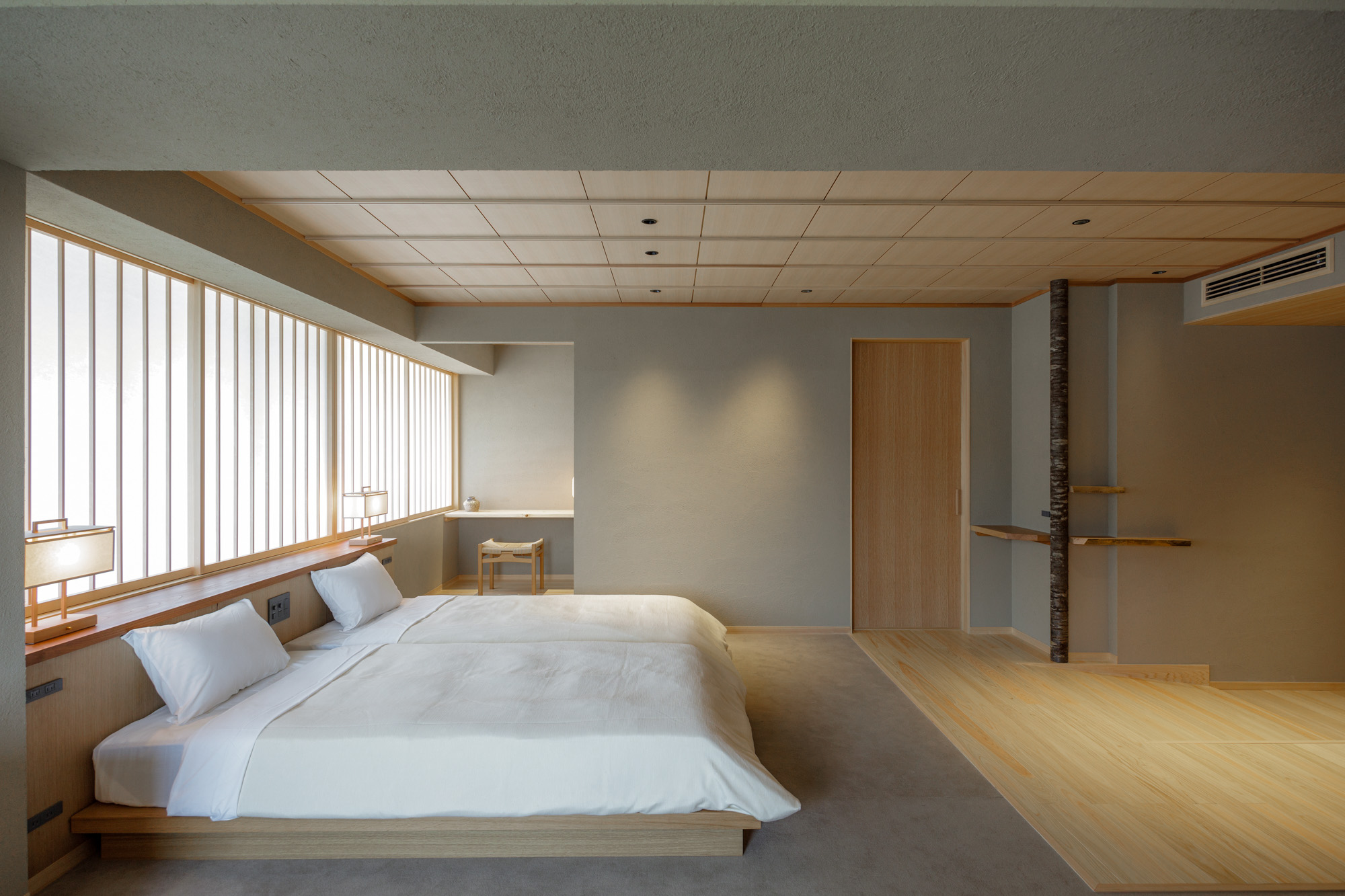 日本旅館である季譜の里が提案する新たな洋室セミスート。左官仕上げの壁に包まれ、土の中にいるような安心と落ち着きを感じられる空間になっています。直線を意識した空間構成や、中村拓志氏がデザインを手掛けたTime & Style の椅子などの家具がモダンな印象をプラス。御影石などの伝統的な和の素材と様式を用いながらも、現代のライフスタイルを紐解いたコンテンポラリーな空間にもなっています。