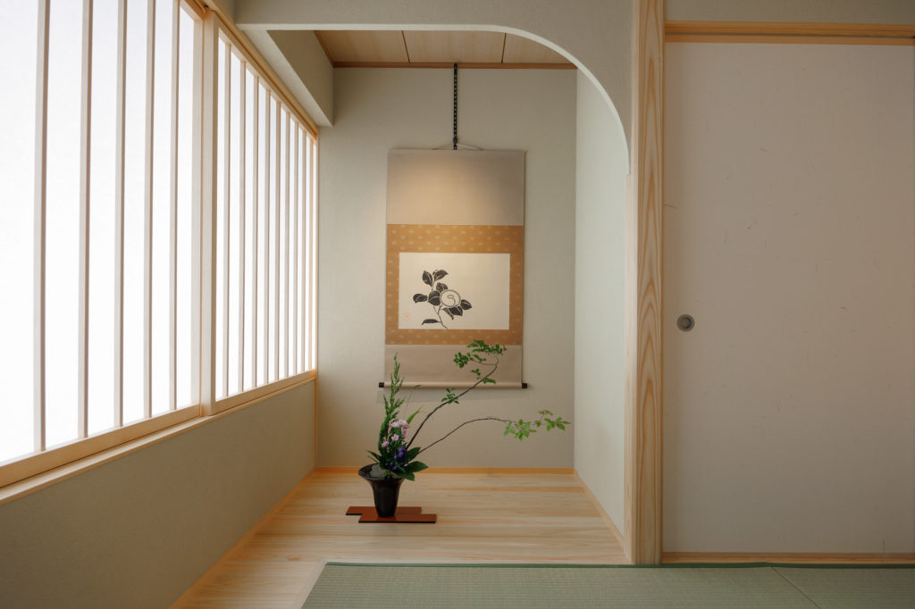 双方段差のないバリアフリーの設計となっており、各部屋には現代のアーティストが手掛ける作品も飾っております。『侘助』には現代性を取り入れることにより、新たな日本の絵画作品の可能性を模索し続けている品川亮氏の椿の掛け軸を。『石楠花』には洗練された造形美が目を引く橋本和哉氏の備前焼の壺を設置いたしました。