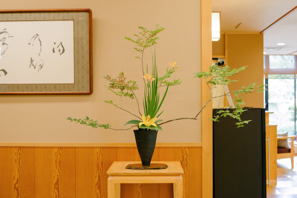 季譜の里は、**「花を楽しむ、なごみの宿」**というコンセプトのもと、館内100か所以上に活け花を設えております。