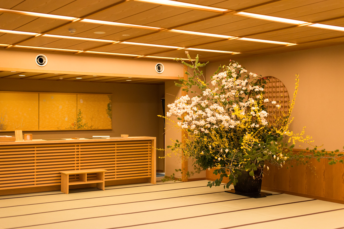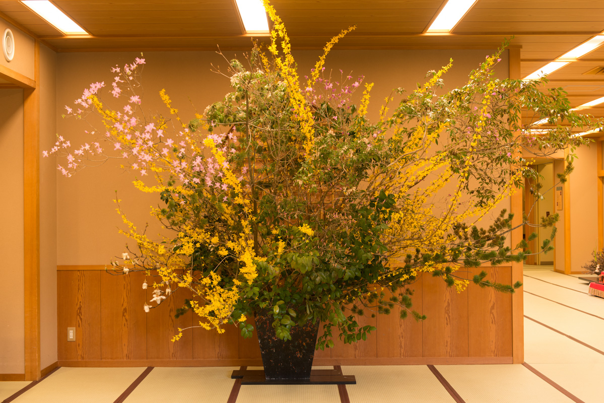 ロビー、フロント前の活け花。こちらは4月に入ってからのものです。レンギョウ、木蓮に加えて向かって左上にのびる山ツツジが花を咲かせています。レンギョウ、山ツツジが重なるのは、例年の中でも珍しい組み合わせです。移り変わるものだからこそ、その時にしか見られないものがある。そんな花々の醍醐味をも感じさせられます。