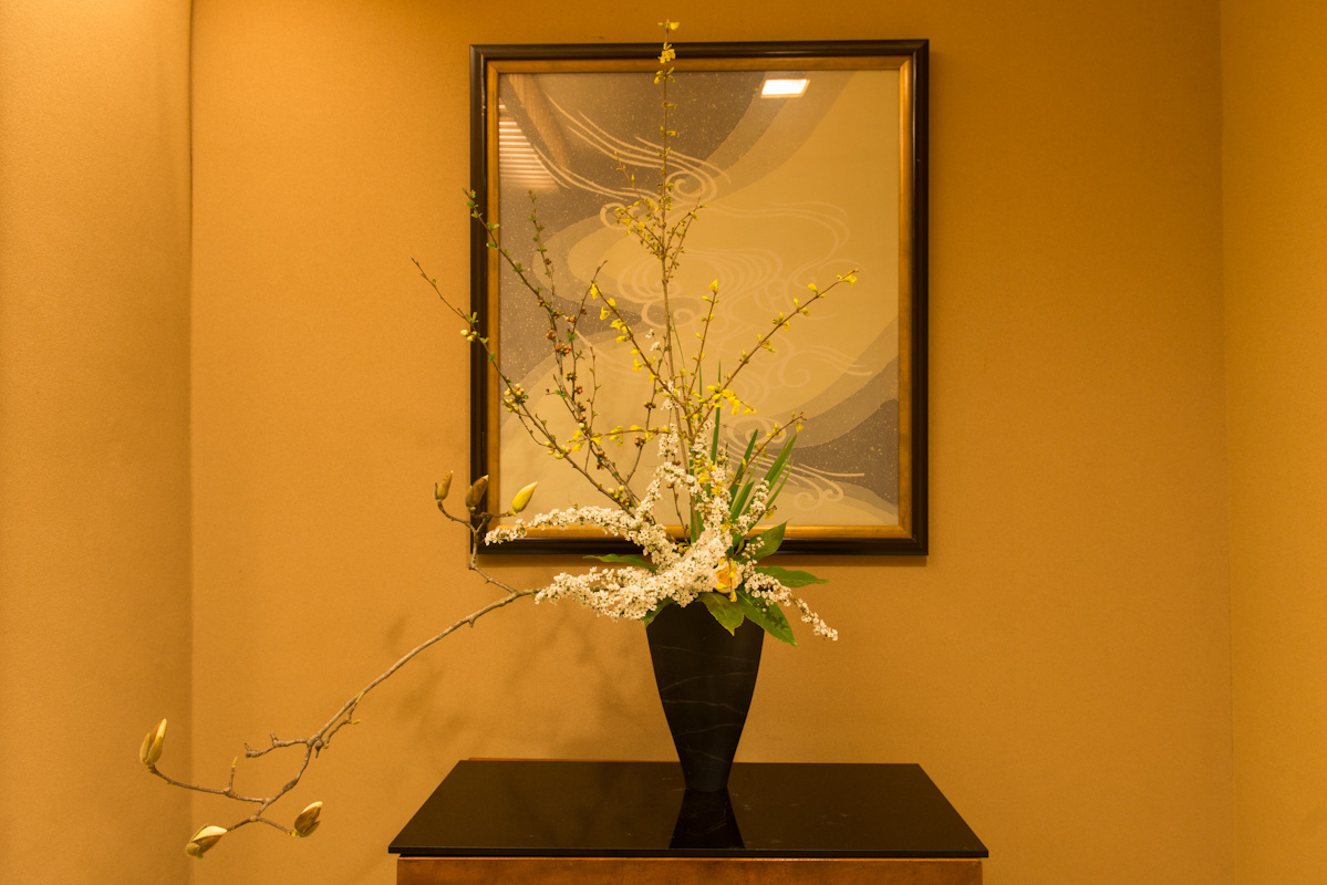 1階のお食事処通路にある活け花。向かって左にのびた木蓮に中央のユキヤナギが印象的です。