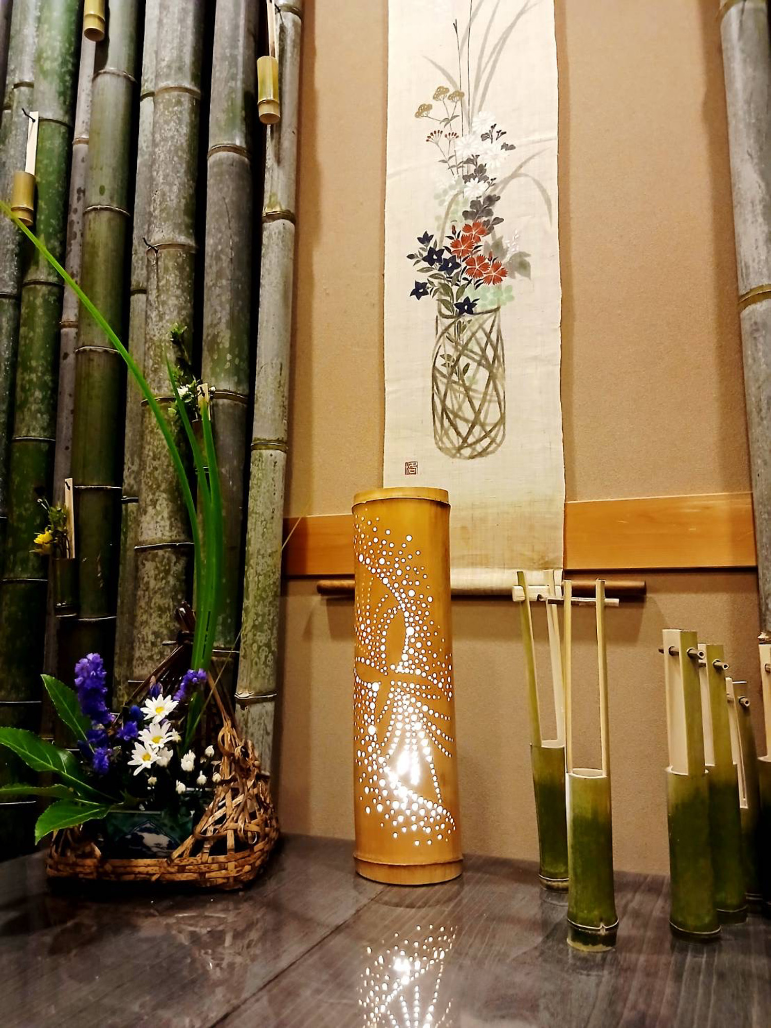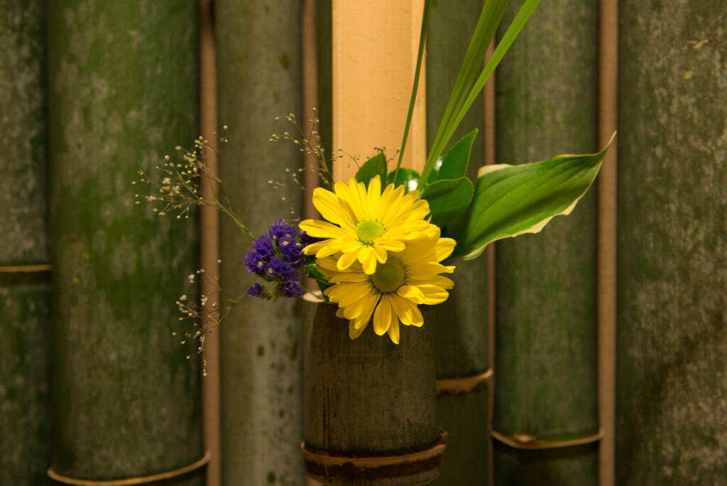 季節の花材を自由に使って竹筒や花器に活けたお花は、竹の壁に掛けて飾ったり、お部屋へお持ち帰りいただくことも可能です。ご滞在の記念にぜひお楽しみください。